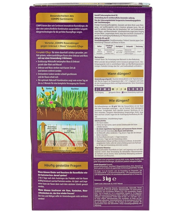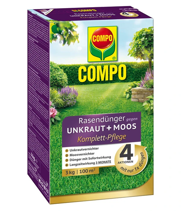 Erstklassige Wirkstoffe im COMPO FLORANID® Rasendünger gegen Unkraut und Moos 4in1 bekämpfen beides mit einer Sicherheit, die Sie restlos überzeugen wird. Die Wirkung erfolgt über Blatt und Wurzel gleichermaßen. Die ungeliebten Gewächse sterben dadurch ab und können einfach aufgesammelt werden. Aber damit noch nicht genug, der COMPO FLORANID® Rasendünger gegen Unkraut und Moos 4in1 ist dank seiner optimalen Nährstoff-Kombination eine Komplett-Versorgung für Ihren Rasen. COMPO FLORANID® Rasendünger gegen Unkraut und Moos 4in1 gibt Ihrem Rasen von Anfang an alles, was er benötigt, um stark und gesund zu bleiben und das über 3 Monate hinweg. In dieser Zeit kann sich dank COMPO FLORANID® Rasendünger gegen Unkraut und Moos 4in1 auch ein schwacher Rasen mit Lücken wieder gut erholen.