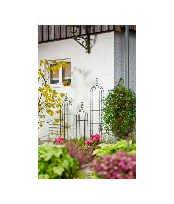 Da es diesen Obelisken in verschiedenen Größen gibt, können Sie ihn ganz individuell an den geplanten Standort in Ihrem Garten anpassen. Er kann solo mitten in einem Beet als Blickfang wirken, er macht sich aber auch mitten im Vorgarten, in einer lauschigen Gartenecke oder gleich direkt neben der Terrasse wunderschön. Gerne wird der Obelisk Classic auch in die Nähe einer Hauswand platziert, wenn man dort zwar Pflanzen in die Höhe ranken lassen, aber kein Rankgitter fest an der Wand anschrauben möchte. Besonders eindrucksvoll ist der Effekt, wenn Sie den Obelisk Classic als Trio in verschiedenen Größen arrangieren. Wichtig: Wenn Sie einen passenden Standort gefunden haben und sich für eine Rankpflanze entschieden haben, sollten Sie immer erst den Obelisk Classic im Boden verankern und dann die Pflanze einsetzen, damit die zarten Wurzeln der Pflanze nicht verletzt werden.