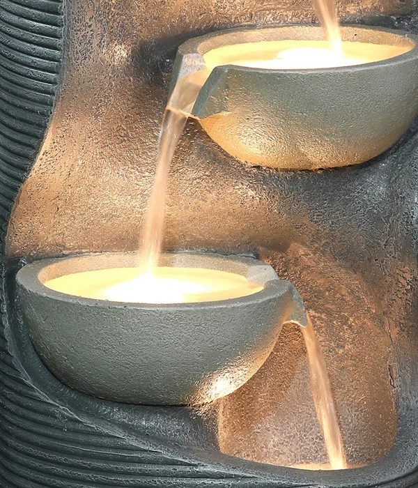 Immer mehr Gartenbesitzer entdecken den Wert eines Wasserspiels in ihrer grünen Oase. Auch Sie spielen mit den Gedanken, Ihre Gartenanlage mit einem Brunnen zu krönen? Dann schauen Sie sich doch diese erlesene Kreation an. Inspiriert von dem klassischen Vorbild des Kaskadenbrunnens hat der Designer hier den Fluss des Wassers über verschiedene Ebenen zeitgemäß interpretiert, sodass sich der Dehner Polyresin-Gartenbrunnen Salo auch wunderbar in moderne Gartenanlagen integrieren lässt. Betrachten Sie bald das ewige Schauspiel, wie das Wasser aus den verschiedenen Schalen bis ins untere Becken fließt und lauschen Sie dabei dem leisen Wassersäuseln – Sie werden sich ab sofort in Ihrem Garten noch besser entspannen. An einem schönen Sommertag, wenn die Sonnenstrahlen die Wassertropfen zum Funkeln bringen wie in den Abendstunden, wenn die vier warmweißen LED-Lichter im Dehner Polyresin-Gartenbrunnen Salo eine magische Stimmung herbeizaubern.