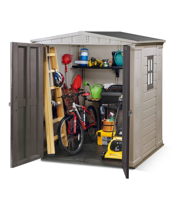 Wer einen Garten hat, kennt das Problem: viele Geräte, jedoch keinen Platz zum Lagern. Abhilfe schafft hier das Keter Kunststoffgerätehaus Factor 6×6. Mit den praktischen Doppeltüren können auch größere Gegenstände, wie z.B. der Rasenmäher oder der Gartentisch einfach untergebracht werden. Zudem beinhaltet das Keter Kunststoffgerätehaus Factor 6×6 eine Entlüftung im Giebel und ein pfiffiges Regalsystem, welches Stauraum für Werkzeuge oder Gartenutensilien bietet. Sobald das Gartenhaus nach einfacher Montage aufgebaut ist, braucht man sich um das oben genannte Problem keine Sorgen mehr machen. Darüber hinaus ist das Keter Kunststoffgerätehaus Factor 6×6 sehr wartungsarm. Sowohl starke Sonneneinstrahlung, als auch Wetterumschwünge übersteht das Häuschen problemlos.