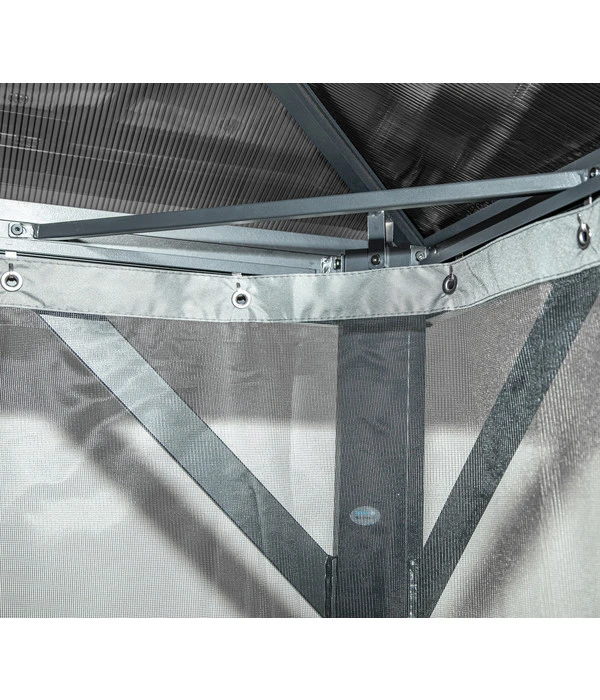 Im Lieferumfang zum Sojag Pavillon Verona sind nicht nur passende Moskitonetze enthalten, sondern auch zweigleisige Laufschienen, sodass Sie zusätzlich Vorhänge anbringen können. Diese sind in edlem Anthrazit als Zubehör erhältlich. Das Besondere an diesem Pavillonmodell: Sie können die Vorhänge und die Moskitonetze gleichzeitig benützen.