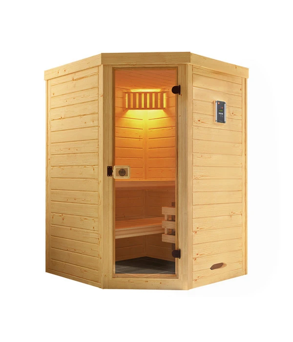 Aber was dürfen Sie von einer Ecksauna Laukkala mit Glastür erwarten? Natürliche Qualität von Weka. Denn vom intelligenten Grundriss, über die Massivholz-Blockbohlen aus naturbelassenem Fichtenholz bis hin zur hochwertigen Tür aus Sicherheitsglas steckt hier in jedem Detail die Erfahrung des Markenherstellers. Die Blockbohlen sind 38 mm stark und so akkurat gearbeitet, dass sich die Teile absolut unkompliziert zusammenbauen lassen und perfekt abdichten – für ein optimales Saunaklima. Das Design des Saunaleuchten-Sets ist optisch dezent und sorgt für eine sanfte Streuung des Lichts im Innenraum. Ganz typisch: Die beiden Liegen sind auf verschiedenen Höhen angebracht. Für Ihren unterschiedlich intensiven Saunagenuss.
