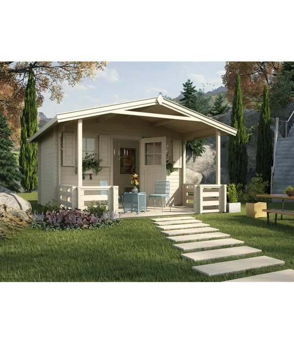 Gartenhaus in stabiler Blockbohlenbauweise, 45 mm Wandstärke, mit 19 mm Massivholzdach und Massivholzboden